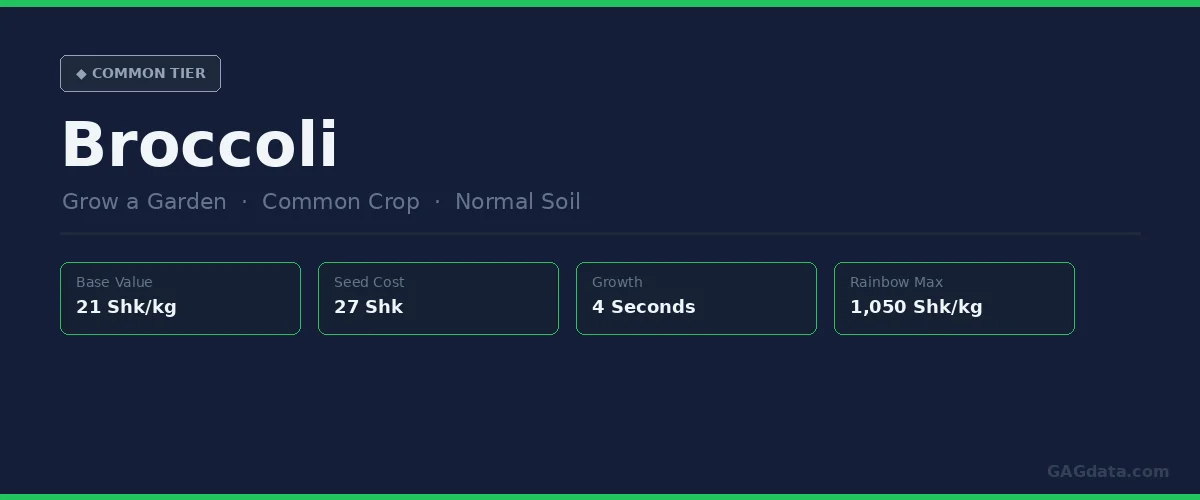 Broccoli has a base value of 21 Sheckles per kilogram in Grow a Garden. It is a Common-tier crop with a 4-second growth time — positioned after Rice (2 seconds) and Turnip (3 seconds) — and grows in Normal Soil. Broccoli is compatible with the Rainbow mutation (50x), reaching a maximum value of 1,050 Sheckles/kg. The table below shows all verified core stats for Broccoli, updated March 2026.