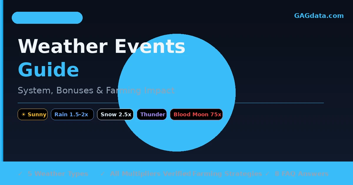 Grow a garden weather events are environmental conditions that directly affect crop growth speed and Sheckle value multiplier bonuses in Grow a Garden. Eight weather event types are active in the game — Sunny, Rain, Snow, Thunderstorm, Blood Moon, Heat Wave, Solar Eclipse, and Black Hole — each providing a unique farming bonus. Weather event multipliers stack multiplicatively with active crop mutations, compounding total Sheckle value at harvest. All values verified through in-game testing by Sam Rivers, GAGdata Crops & Values Database Manager.